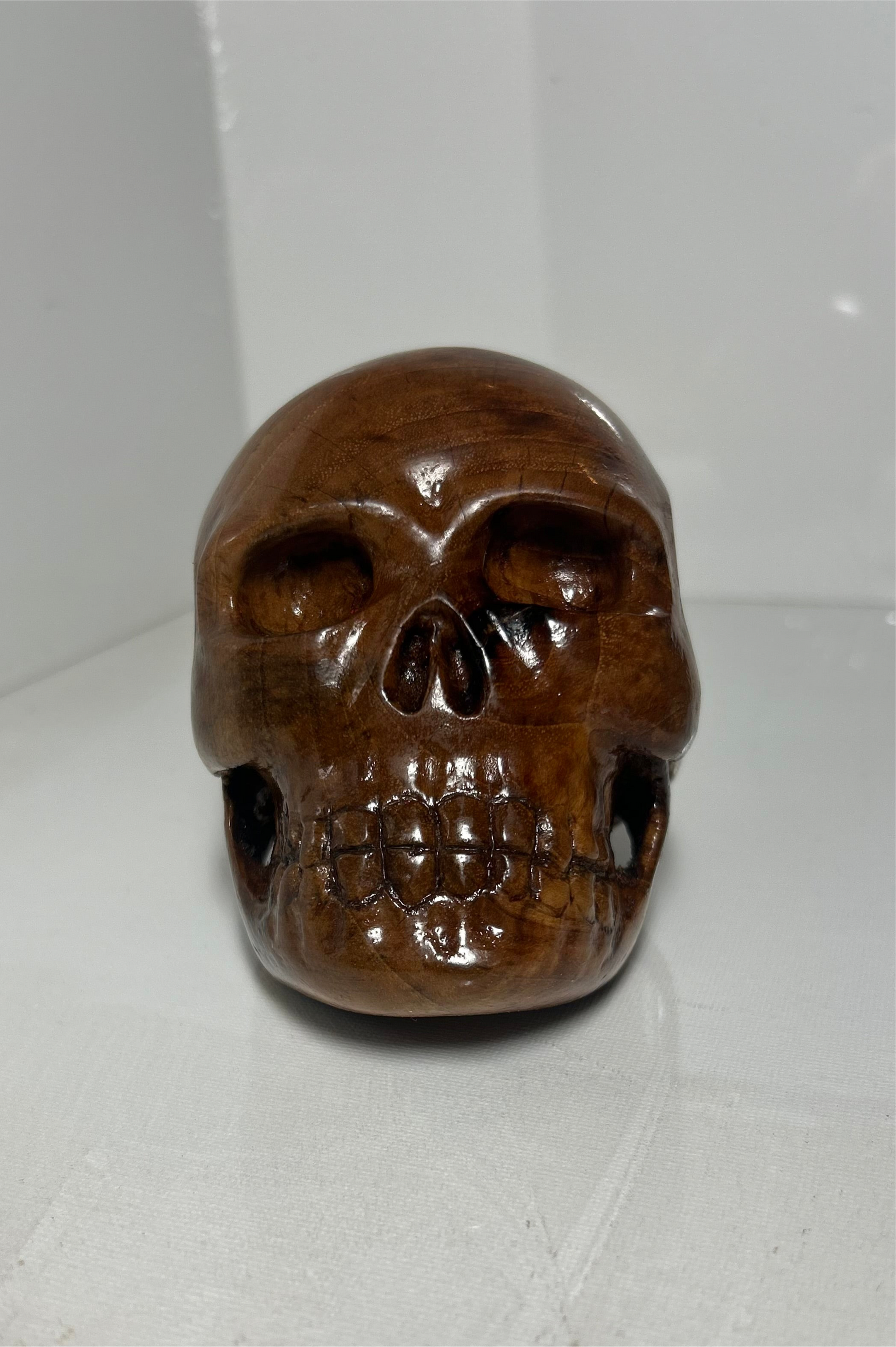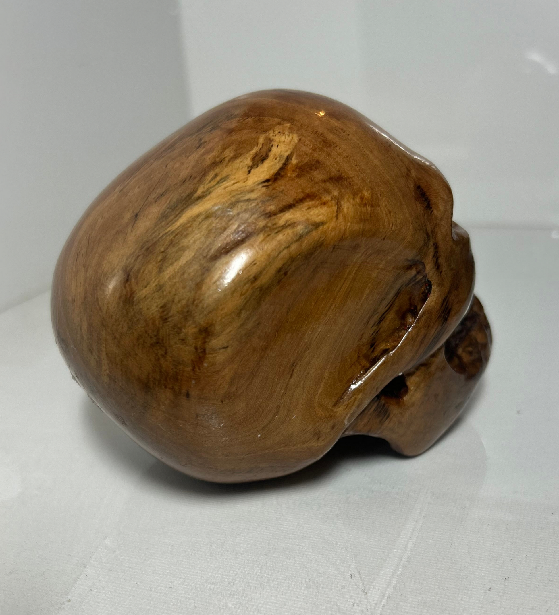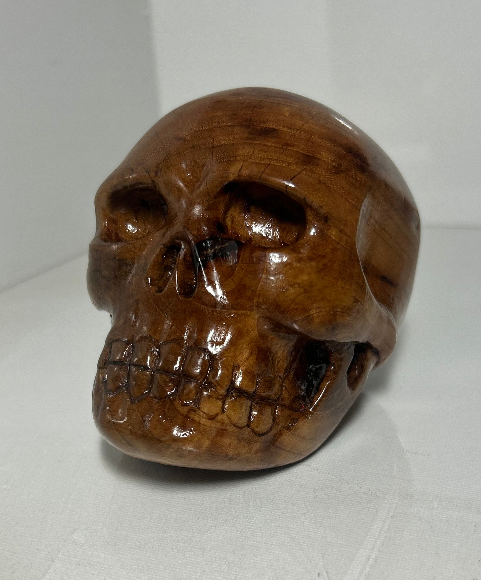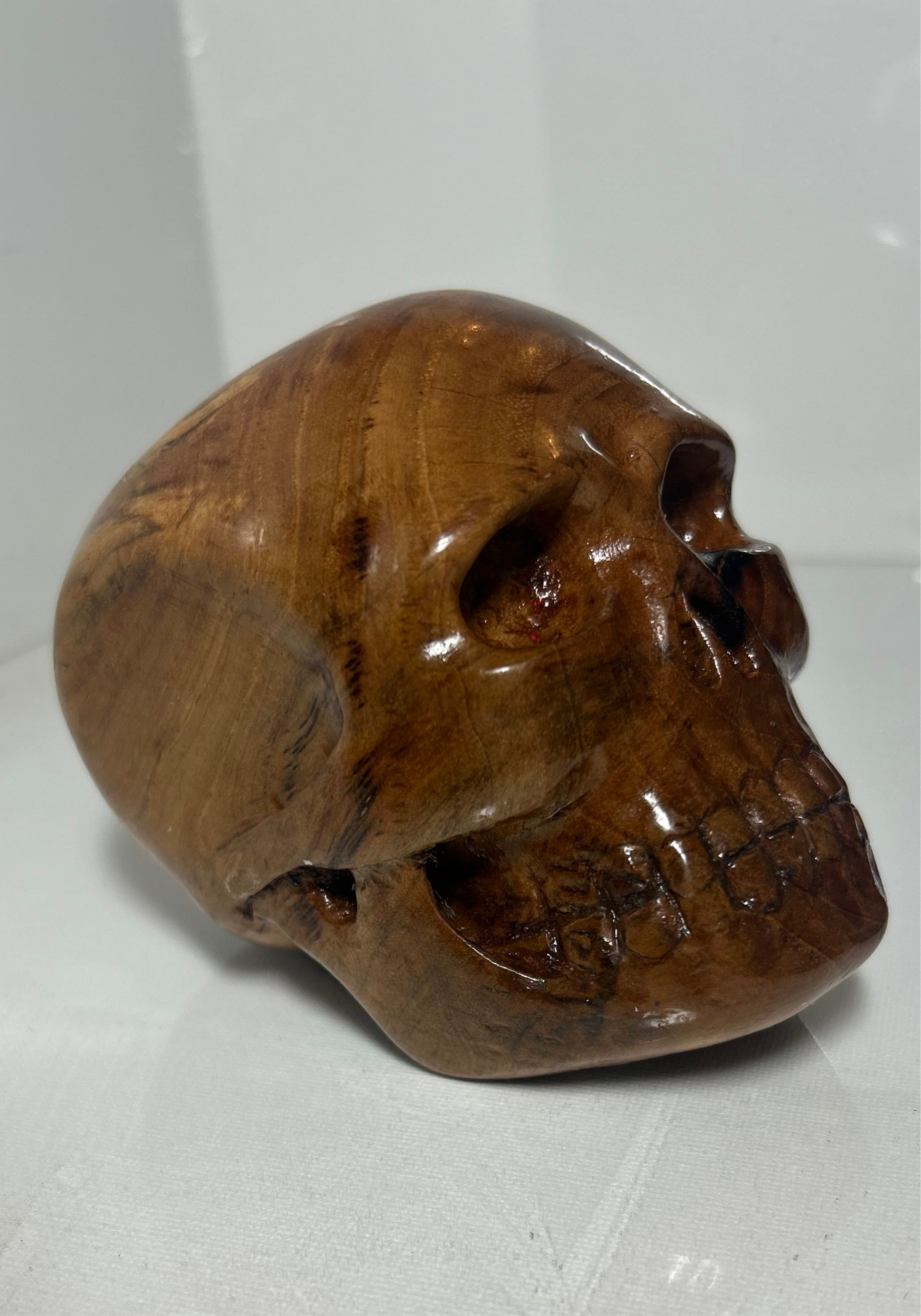 “Eternal Grain” is a hand-carved skull sculpture crafted from locally sourced pecan wood, its warm, natural tones revealing the intricate grain of a life once rooted in the earth. The piece evokes both fragility and endurance—an homage to the cycle of decay and rebirth found in nature and humanity alike.