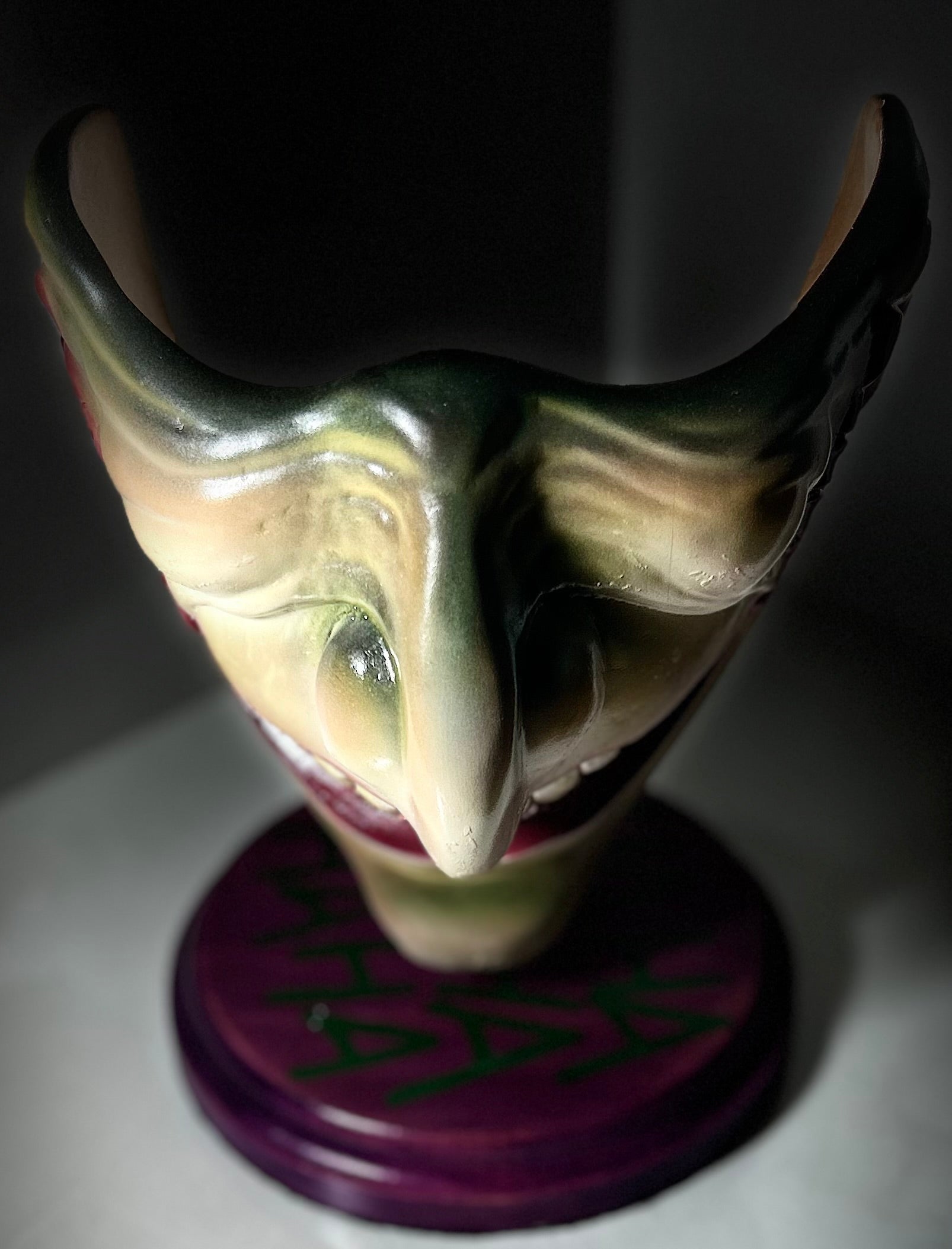 Samurai Smile is a striking sculptural piece that fuses the chaotic energy of the Joker with the solemn tradition of the samurai menpo, or face mask. The exaggerated grin—distorted, toothy, and blood-tinged—captures the essence of madness, while the form itself pays homage to the protective facial armor once worn by warriors of feudal Japan. Painted in an iridescent mix of green, ivory, and purple, the mask seems to shimmer with menace. Its base, a bold purple disk tagged with green graffiti laughter, reinforces the Joker’s anarchic legacy. This fusion of cultural symbolism and comic book villainy offers a haunting meditation on identity, fear, and power.